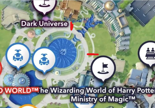 In the image above, you can see red marks which is roughly where the line stops after you cross security. From there, two locations are close to Helios guests – Ministry of Magic and Dark Universe. For “rope droppers”, Battle of the Ministry is the go-to location even if the ride doesn’t technically start until later. Our group was probably the lucky few that ran/speed walked to the ride.